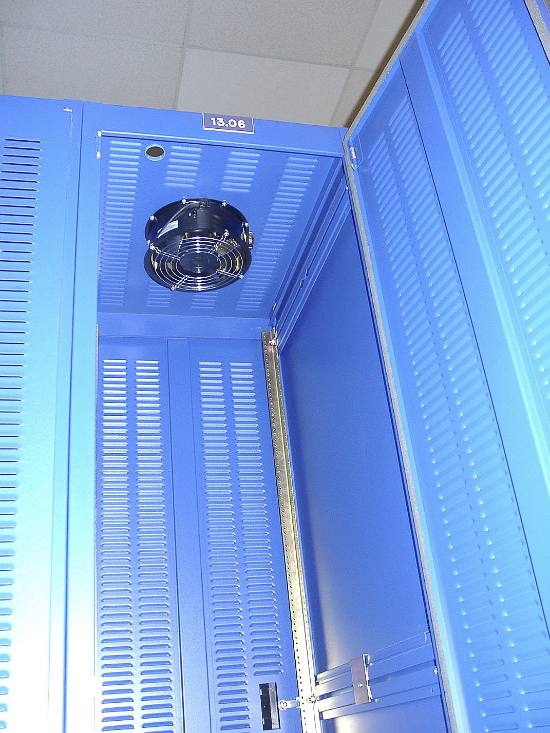 Warm air is removed with an exhaust fan at the top of each cabinet. The fan exhausts 550CFM (Cubic Feet per Minute). Also at the top of the cabinet, two cable-access openings are provided for copper and fiber optic cables.