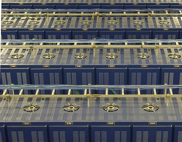 Fiber optic and copper cables are placed on raised ladders and conduits above each row of cabinets.